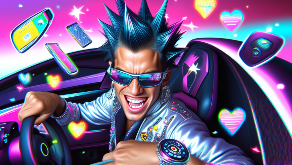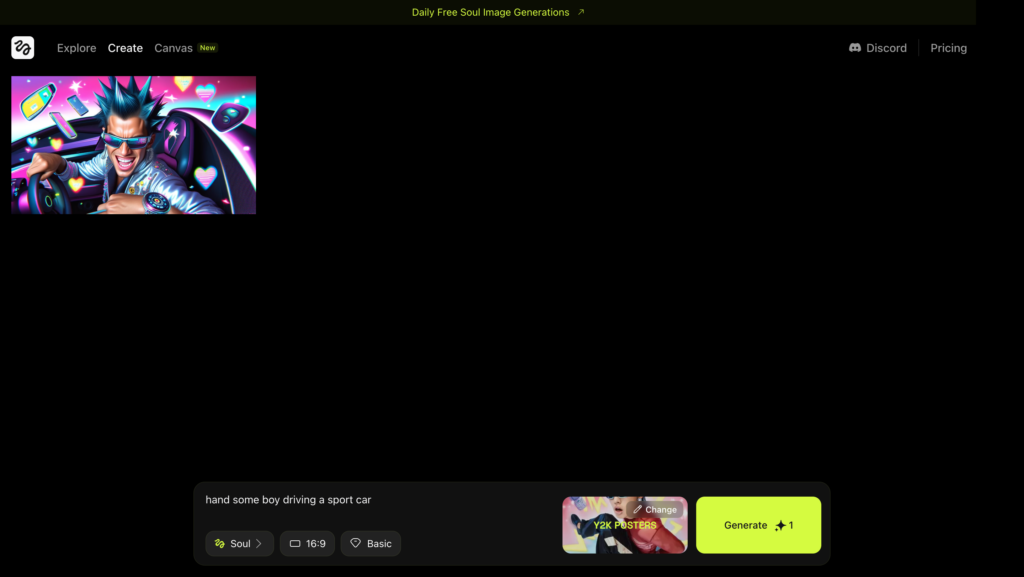 実際に英文プロンプト「スポーツカーを運転するイケメン」を入力し、スタイル「Y2K POSTERS」を指定してから画像を生成すると…