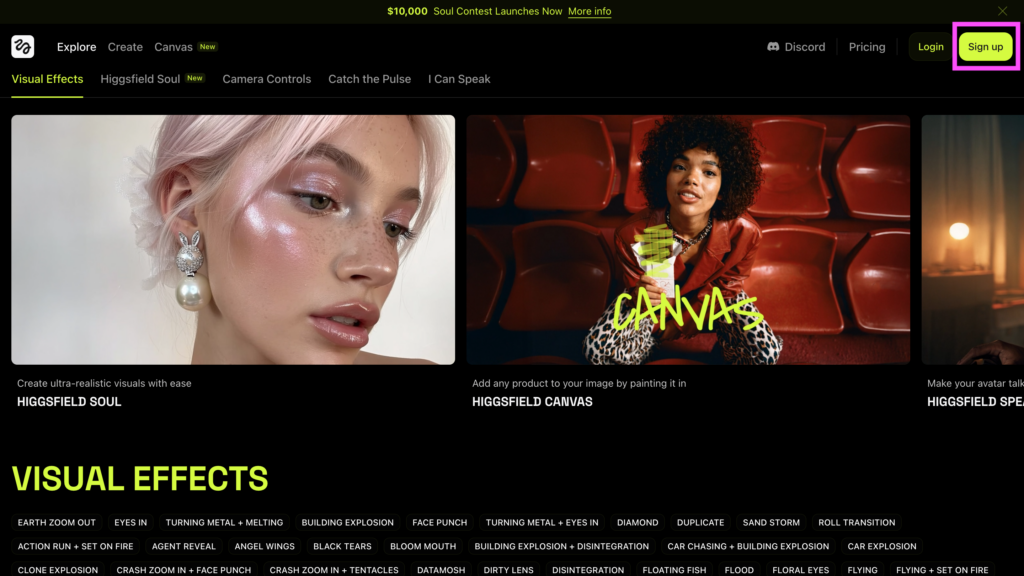 まずは、Higgsfield AIのトップ画面にアクセスして、ログイン用のアカウントを作成します。では早速、トップ画面右上の「Sign up」ボタンをクリックしてみましょう!