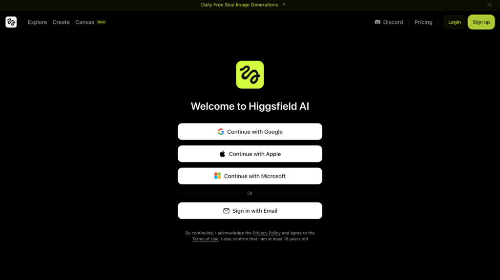 ここからはHiggsfield AIの使い方を、実際の画面とともにご紹介。以下、アカウントを開設するところから、詳しい手順をみていきましょう!