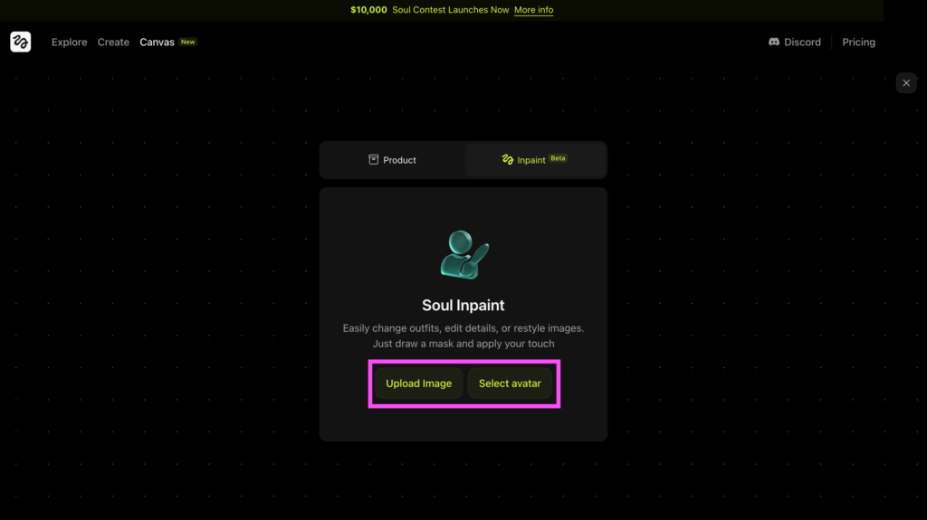 Higgsfield AIでは、画面左上「Canvas」欄から画像の挿入(Product)と上塗り(Soul Inpaint)も可能。うち、以下では2025年7月4日に追加された「Soul Inpaint」の操作手順をみていきましょう!