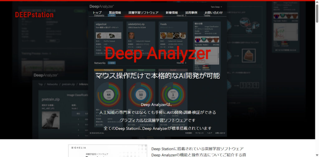 | Deep Analyzer | マウス操作だけで簡単にAI開発が行えるGUIツール。工場の異常検知システムや自動運転の物体検知で活躍できるAIを開発できる。 | 要問い合わせ | あり | https://deepstation.jp/deep_analyzer/ |