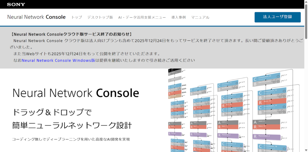 | 機能・特徴 | SONYが開発したAI開発ツール。コーディング無しのドラッグ&ドロップで、簡単にニューラルネットワークを設計できる。 |
