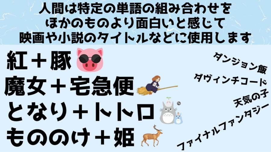 「となりのトトロ」「もののけ姫」「涼宮ハルヒの憂鬱」「天気の子」などは、2つの単語の組み合わせの巧みさによって面白さを演出することで、人々の記憶に深く残っています。