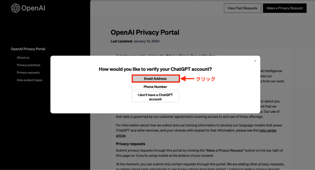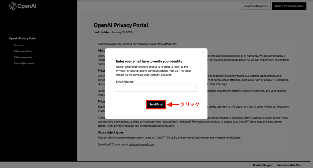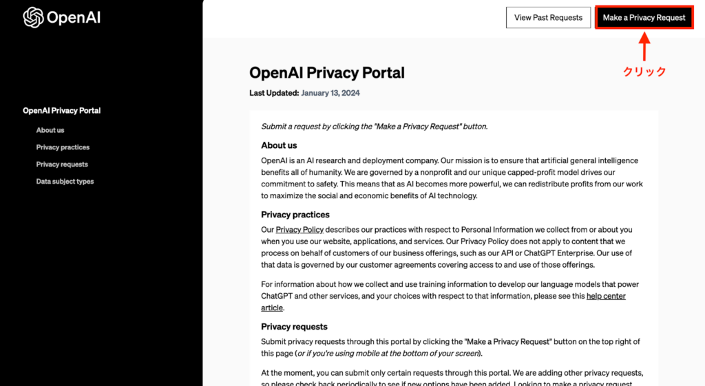 手順も簡単で、OpenAI Privacy Portalへアクセスします。