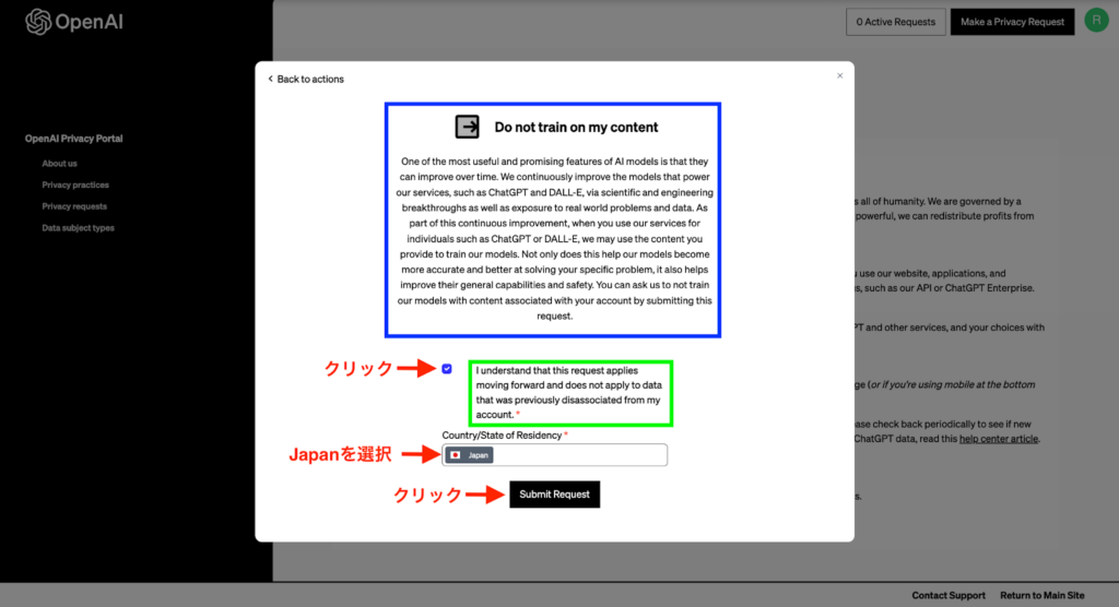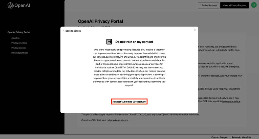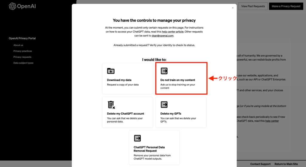OpenAIのプライバシーポータルからも、会話履歴やデータを学習しないようにするためのリクエストを送ることができます。
