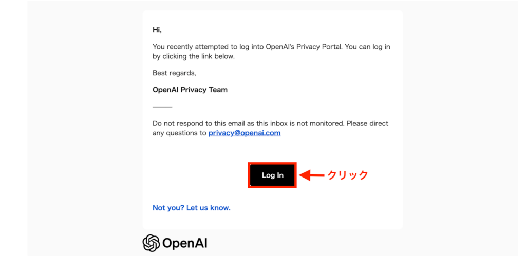 先ほど入力したEメールアドレス宛に、OpenAIから上記のようなメールが届きますので、「Log In」をクリックします。