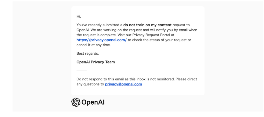 リクエストが正常に処理されると、OpenAIから上記の「Your Do not train on my content request is complete」のメールが届くので、このメールが届けば作業終了です。