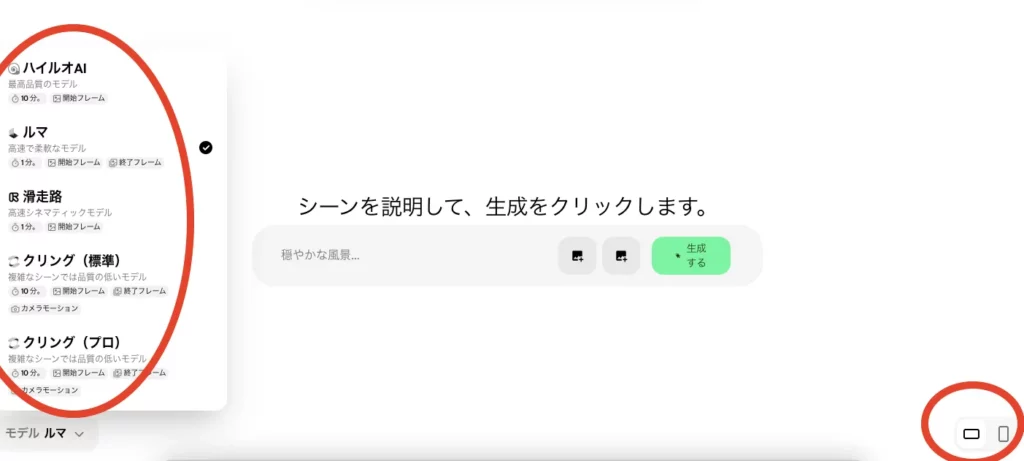 画面左下で使いたい動画生成AIのモデルを選び、右下で縦横の向きを設定します。