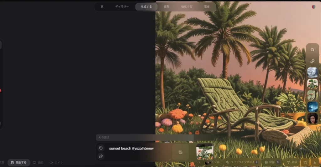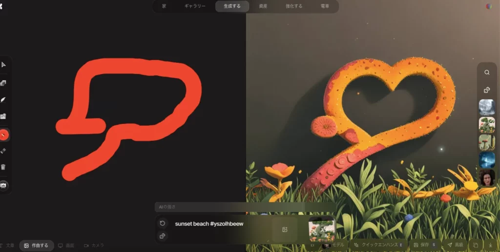 描き始める前に、右側のパネルで画像のスタイルを決めておきましょう。「写真風」「油絵風」「アニメ風」など、さまざまな表現が選べます。画面の入力欄には、作りたい画像の説明を英語で書き込みます。例えば「夕暮れの海辺」なら「sunset beach」と入力。