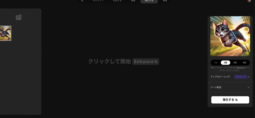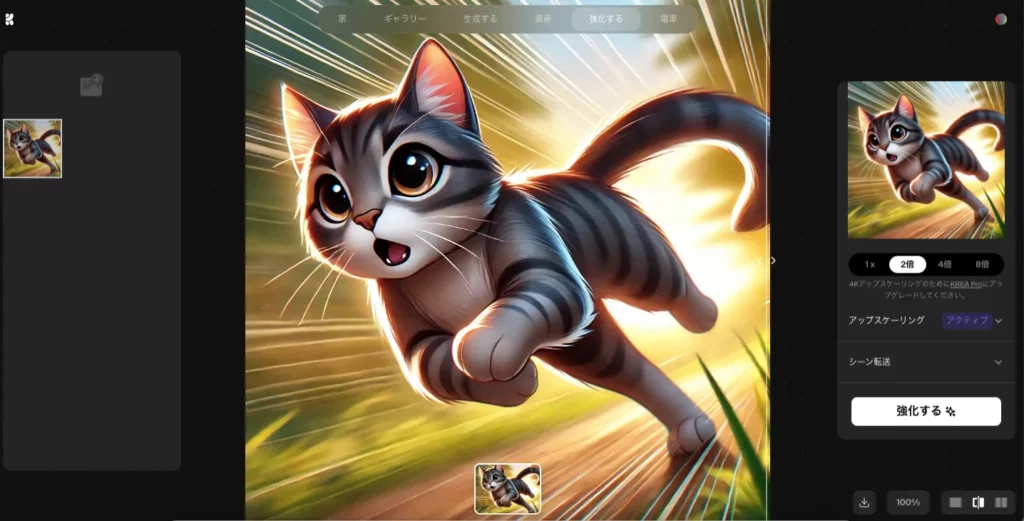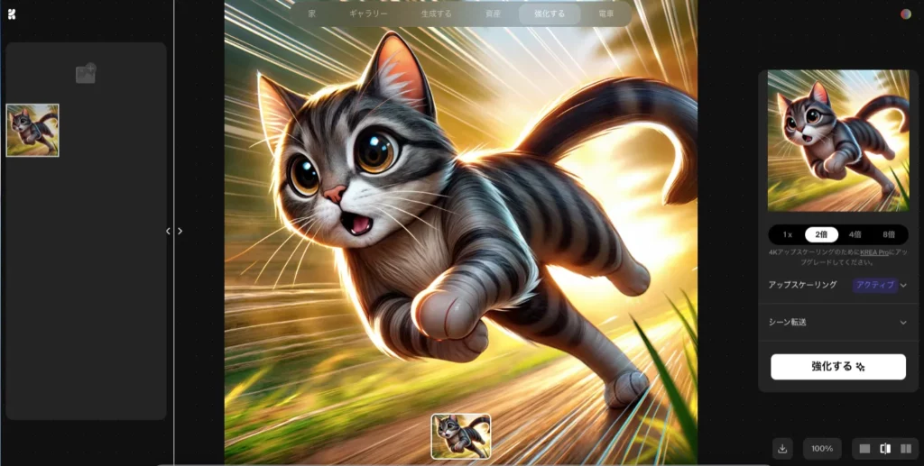 右側の入力欄から設定をして「強化する」をクリック。ちなみに、高画質化は2倍から最大8倍まで設定可能。数値を上げると細部まで鮮明になりますが、処理時間は少し長くなります。