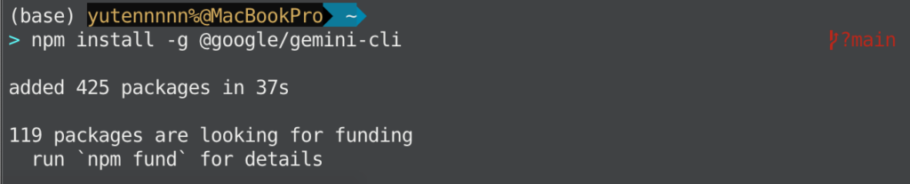 npm install -g @google/gemini-cli実行後、以下のような出力が返ってきたらOKです。