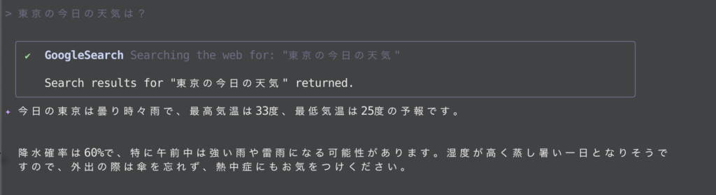 最新情報をWebサーチして、「傘を忘れず」などの提案までしてくれています。