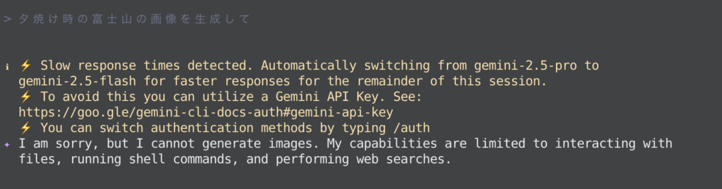 また、リクエスト数が上限に近づいてきた旨の警告が出た際のTipsとして、AI StudioでAPI キーを発行し、export GEMINI_API_KEY=”xxxxx” を設定するだけで従量課金モードへ切り替えることもできます。