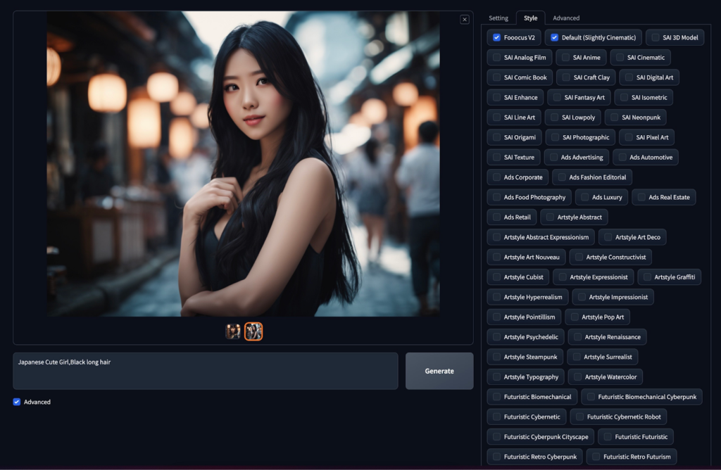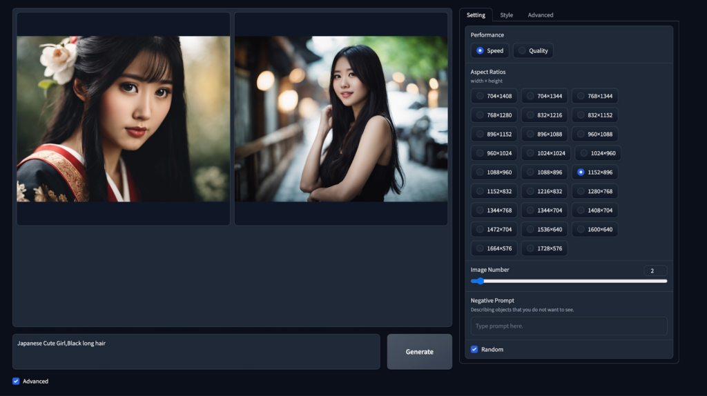 導入は非常に簡単で、ローカルだけでなくColab上で動作させることもできるため、スペックが足りないという方も気軽に使用が可能です。実際に使ってみると、簡単なプロンプトを入力するだけで高精細な画像を生成することができ、Advanced機能を使用するとさらに詳細な設定を行って画像を生成できました。