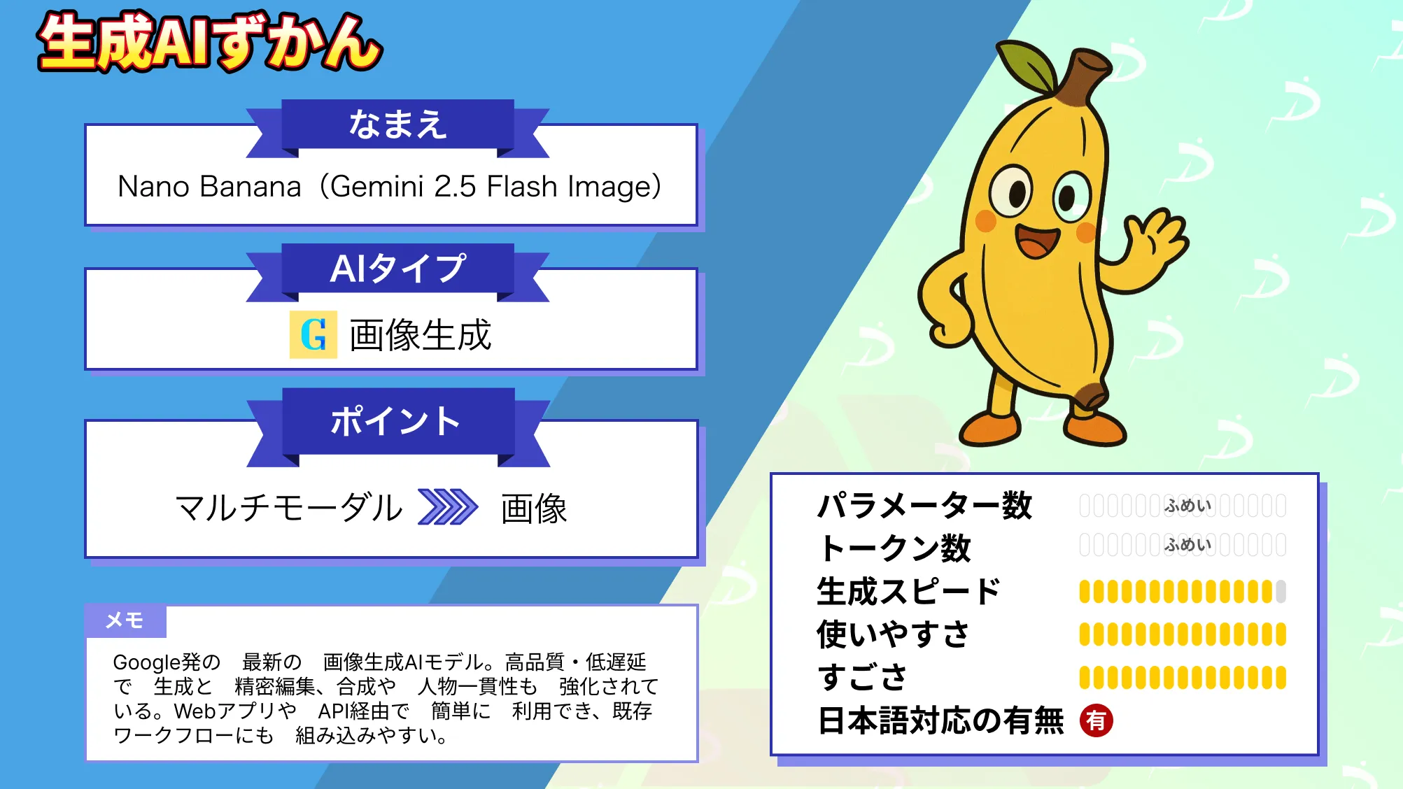 なお、従来モデル「Nano Banana(Gemini 2.5 Flash Image)」について詳しく知りたい方は、以下の記事も参考にしてみてください。