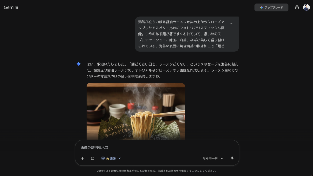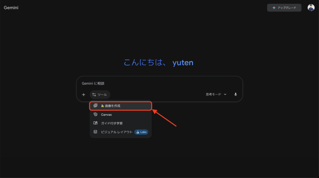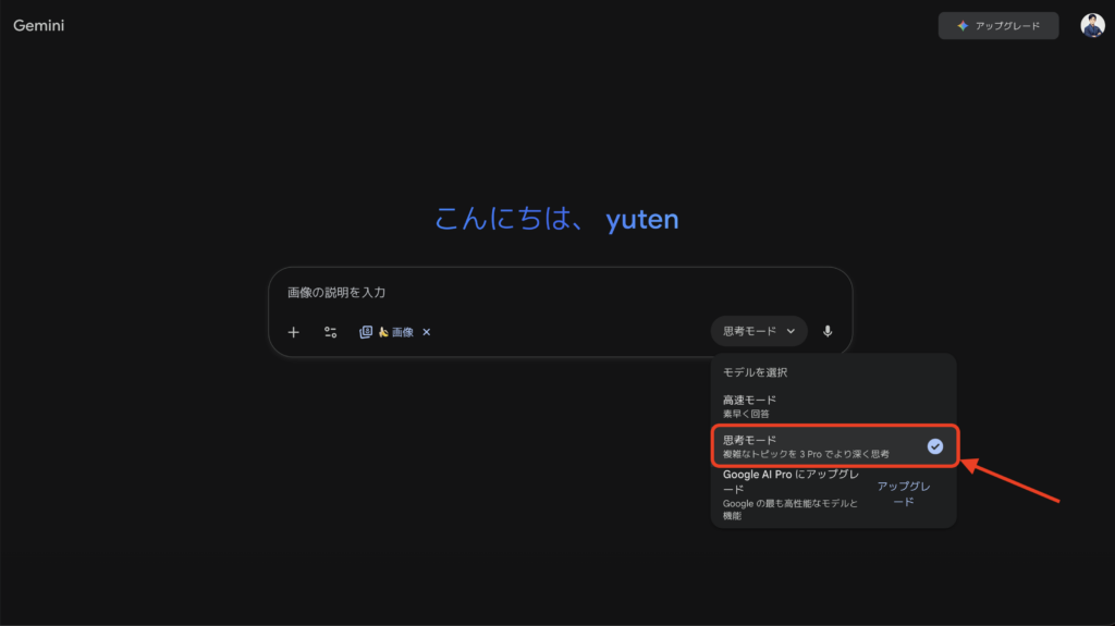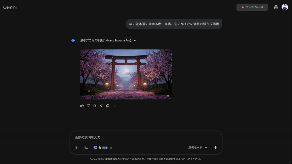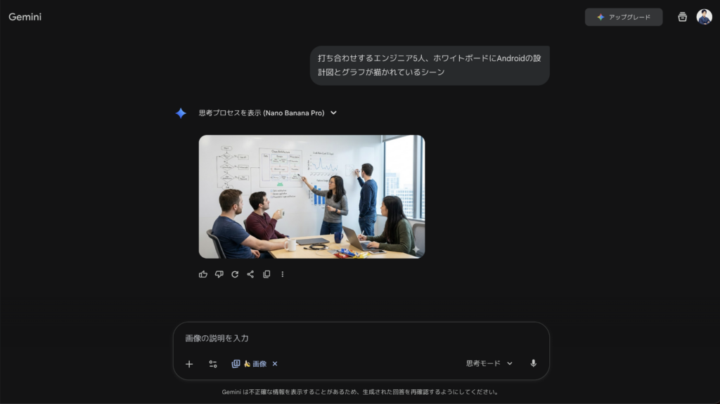 使い方といっても簡単で、Geminiアプリへアクセスし、「画像を作成(Create image)」を選び、Nano Banana Pro対応「思考モード(Thinking)」のモデルを選択するだけで利用することができます。