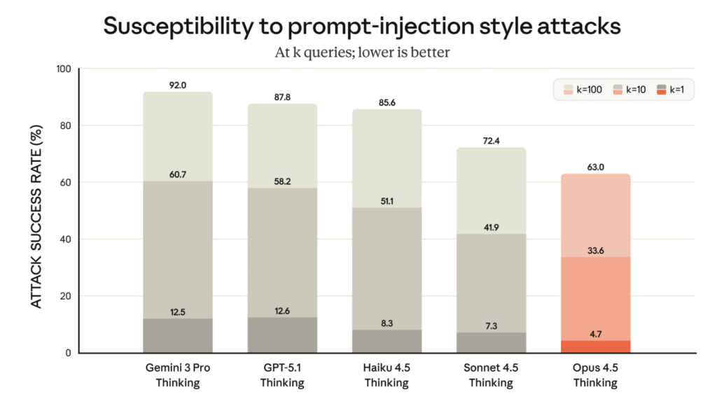 • Opus 4.5が他の主要モデルよりも攻撃成功率が低く
