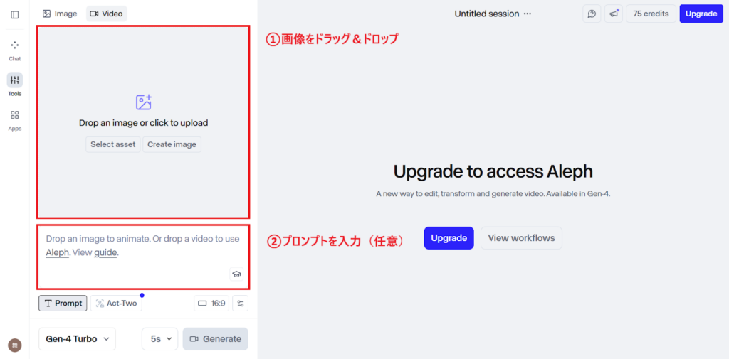 ここからは早速、Runway Gen-3/Gen-4の「Image to Video」の使い方をお伝えしていきます。以下、順を追ってみていきましょう!なお、Gen-3/Gen-4での「Image to Video」は、有料版Runwayユーザーのみ可能です。