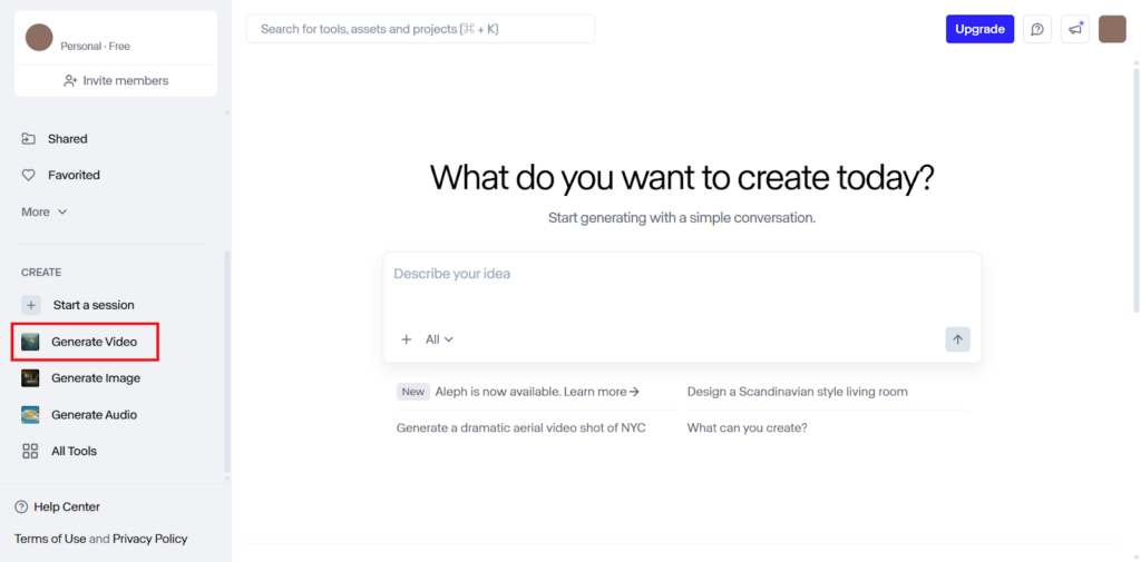 このように「Gemerate  Video」と書かれた欄があるはずです。そこをクリックすると、Gen-3とGen-2(先代モデル)の操作画面に遷移できます。