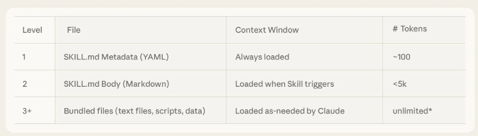 また、スキルは段階的に情報を開示する設計を採用しており、Claudeはタスクに関係する情報のみを文脈にロードします。段階的に情報を開示することで、不要なトークン消費を抑えながら、膨大な知識を扱うことが可能です。