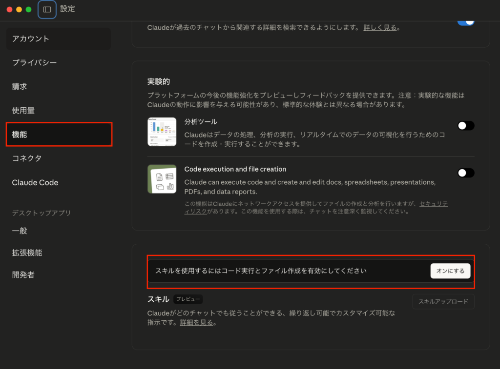 準備ができたら、Anthropicコンソールから「Skills」を有効化します。TeamやEnterpriseプランでは、管理者権限での有効化が必要な場合があります。