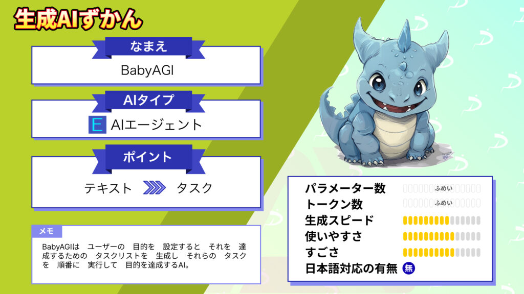 BabyAGIとは、人工知能を活用して特定の目標を達成するためにタスクを自動生成、実行、優先順位付けするプログラムです。名前といい、赤ちゃんがモチーフの公式アイコンといい、なんとも可愛らしい印象を受けますが実はこのAIツール、超絶ハイスペックなんです!