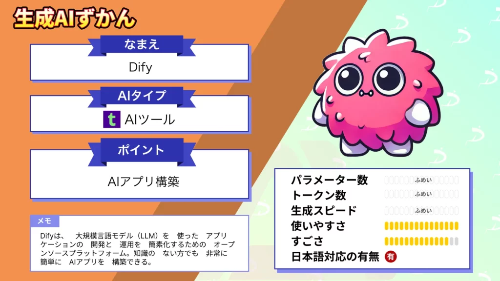 - DifyはLLMを活用し、AIアプリ開発をノーコードで簡素化できるオープンソースプラットフォーム