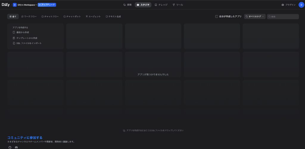 スタジオ機能は、アプリケーションの構築や管理を行える機能で、Difyのメイン機能といっても良いでしょう。
