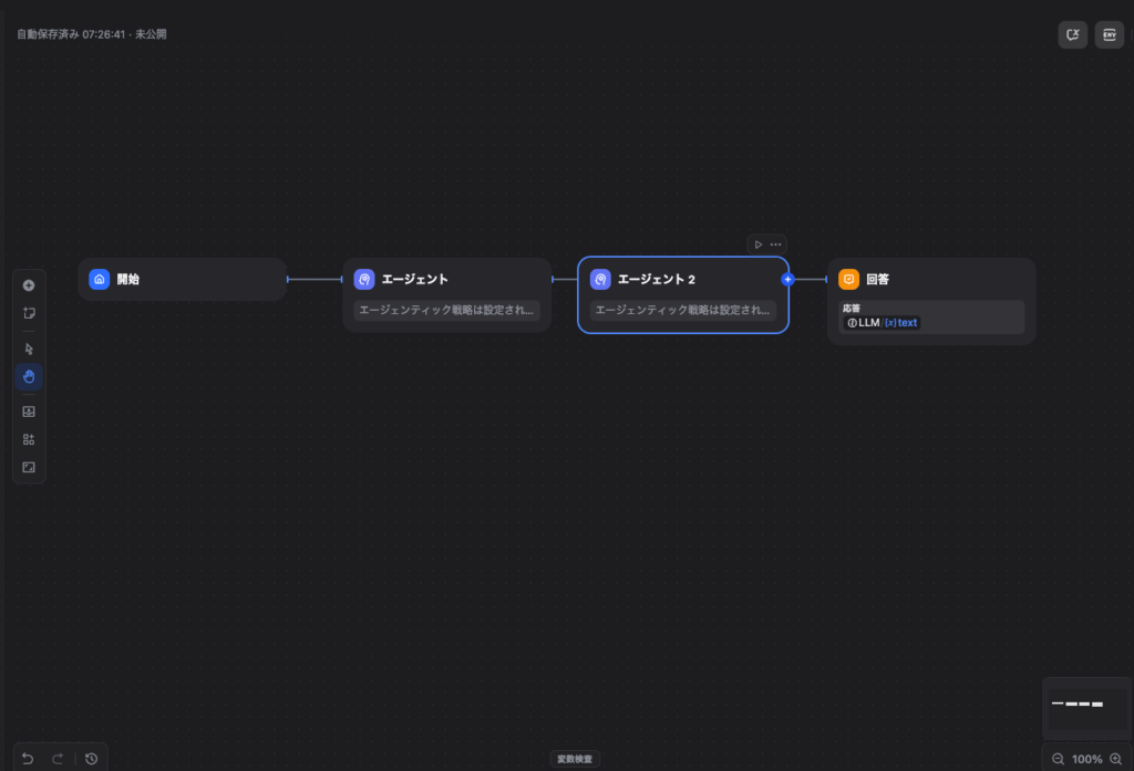 エージェントは2個使うので、もうひとつ追加しておき、それぞれを線でつないでおきます。