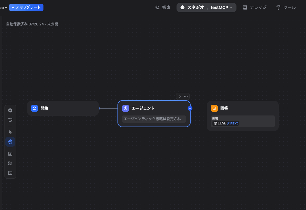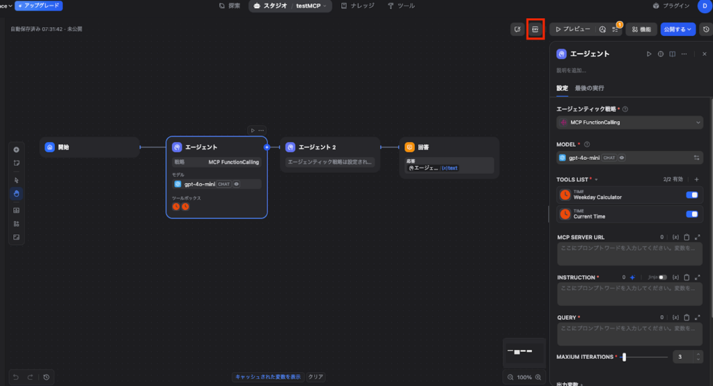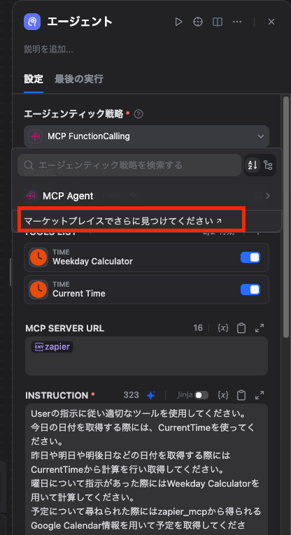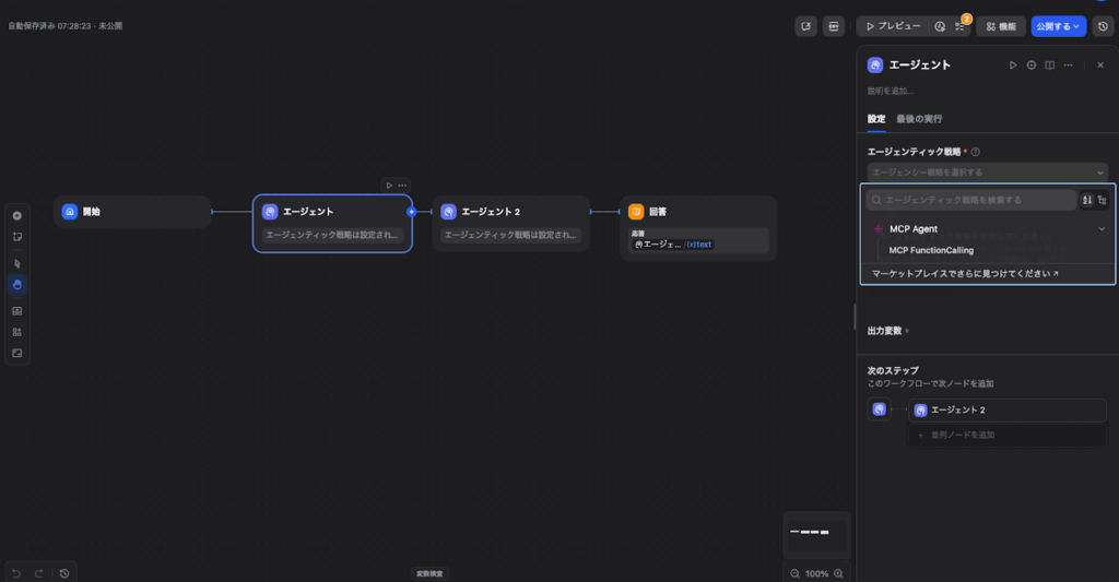 チャットフロー設定画面に戻り、「エージェンティック戦略」をもう一度クリックすると「MCP Agent – MCP FunctionCalling」が表示されるので、これを選択します。