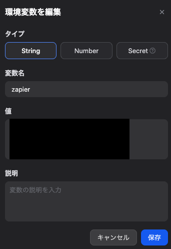 上記画像の赤枠部分をクリックして、環境変数を編集→Stringを選択し、変数名を適当に設定、値をペーストします。