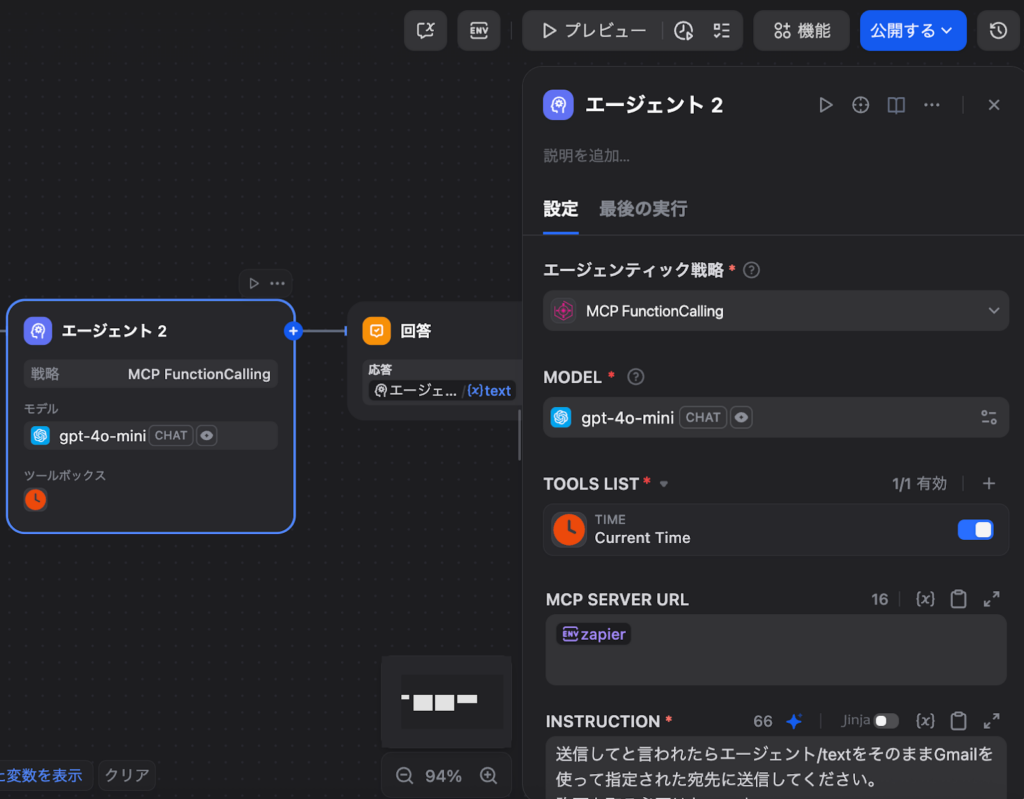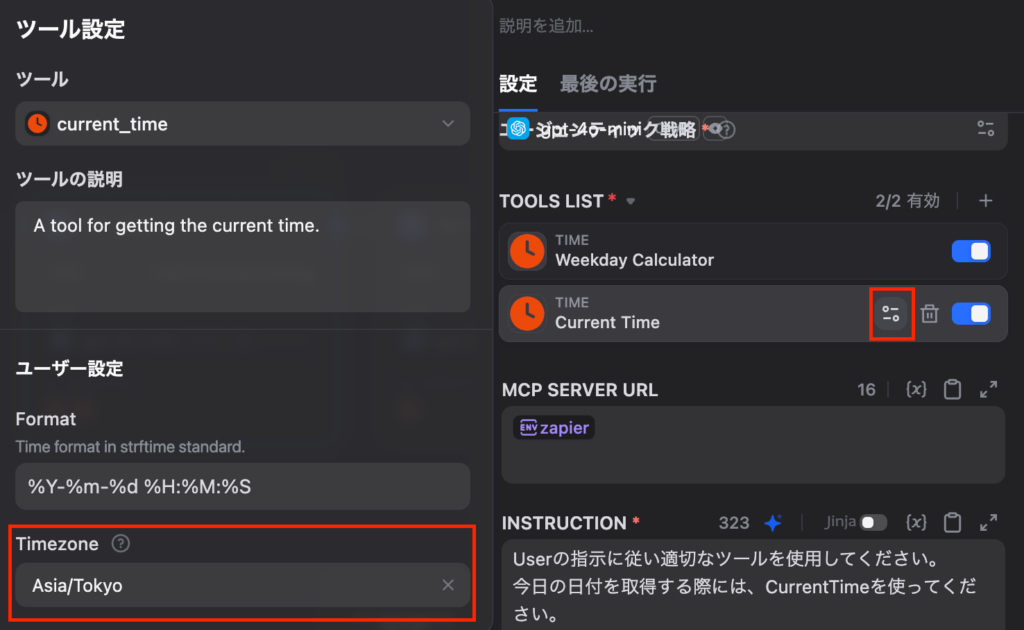 TOOLS LISTは今回はCurrent Timeのみ選択し、MCP SERVER URLは環境変数で設定したものを選択。
