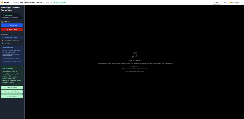 Omnilingual ASRはデモ版もしくはGitHubからダウンロードしてローカル環境で実行する2通りがあります。