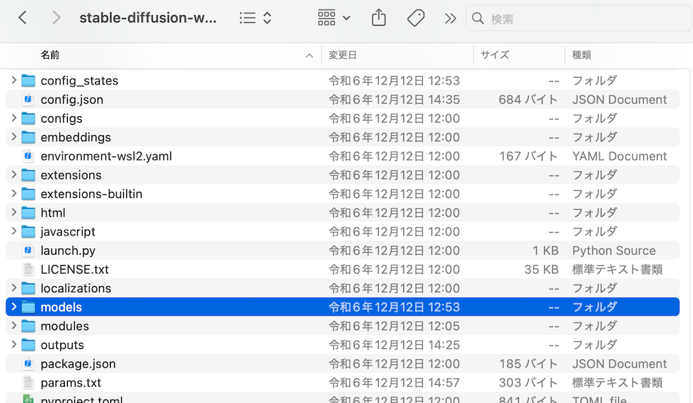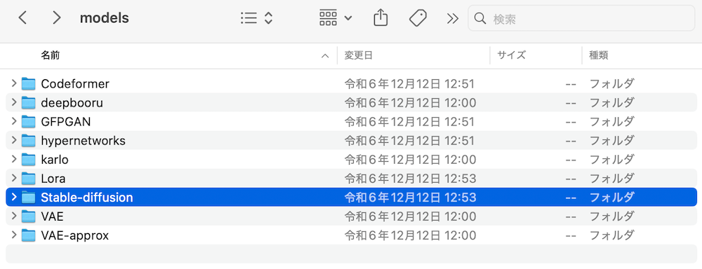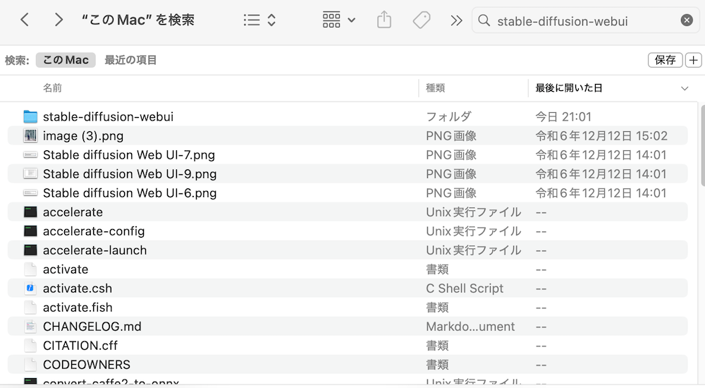 まずはFinderを開いて、「stable-diffusion-webui」のファイルを検索して見つけ出します。
