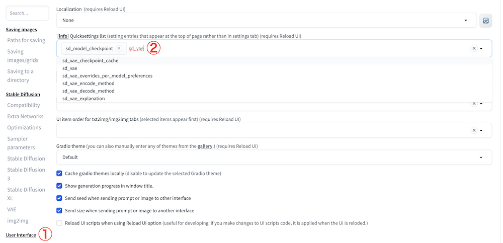 上記画像の②の場所にカーソルを合わせて「sd_vae」と入力して、候補に出てくる「sd_vae」をクリックしてください。