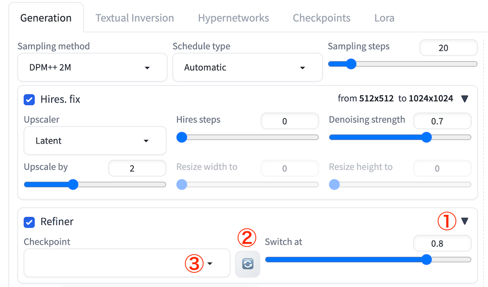 「Checkpoint」の更新ボタンを押してから、プルダウン内で「sd_xl_refiner_1.0.safetensors」を選択してください。