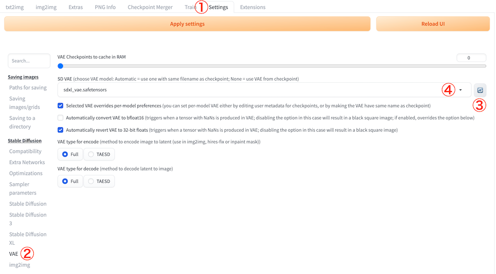 次は「Settings」タブを開いたあと、サイドバーの「VAE」を開きます。その後、「SD VAE」から「sdxl_vae.safetensors」を選択してください。