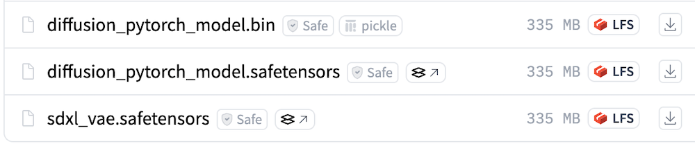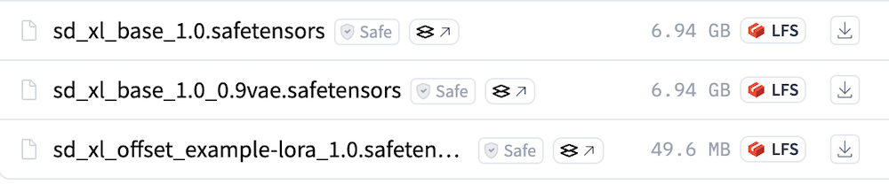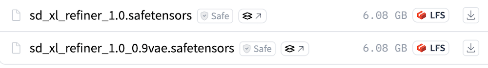 上記画像のうち、1番上の「sd_xl_base_1.0.safetensors」をダウンロードします。